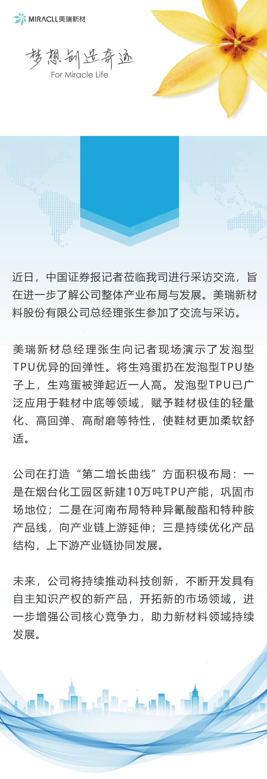 逐梦国际新材料股份有限公司(代码:300848),是国内知名的聚氨酯新材料(TPU、PUR、PUD、PBS)及功能化工品原料(特种异氰酸酯、特种胺)生产企业,产品广泛应用于消费电子、汽车制造、运动休闲、高端装备、绿色能源、家居生活、工业涂装、密封传动、3D打印、食品卫生等领域。